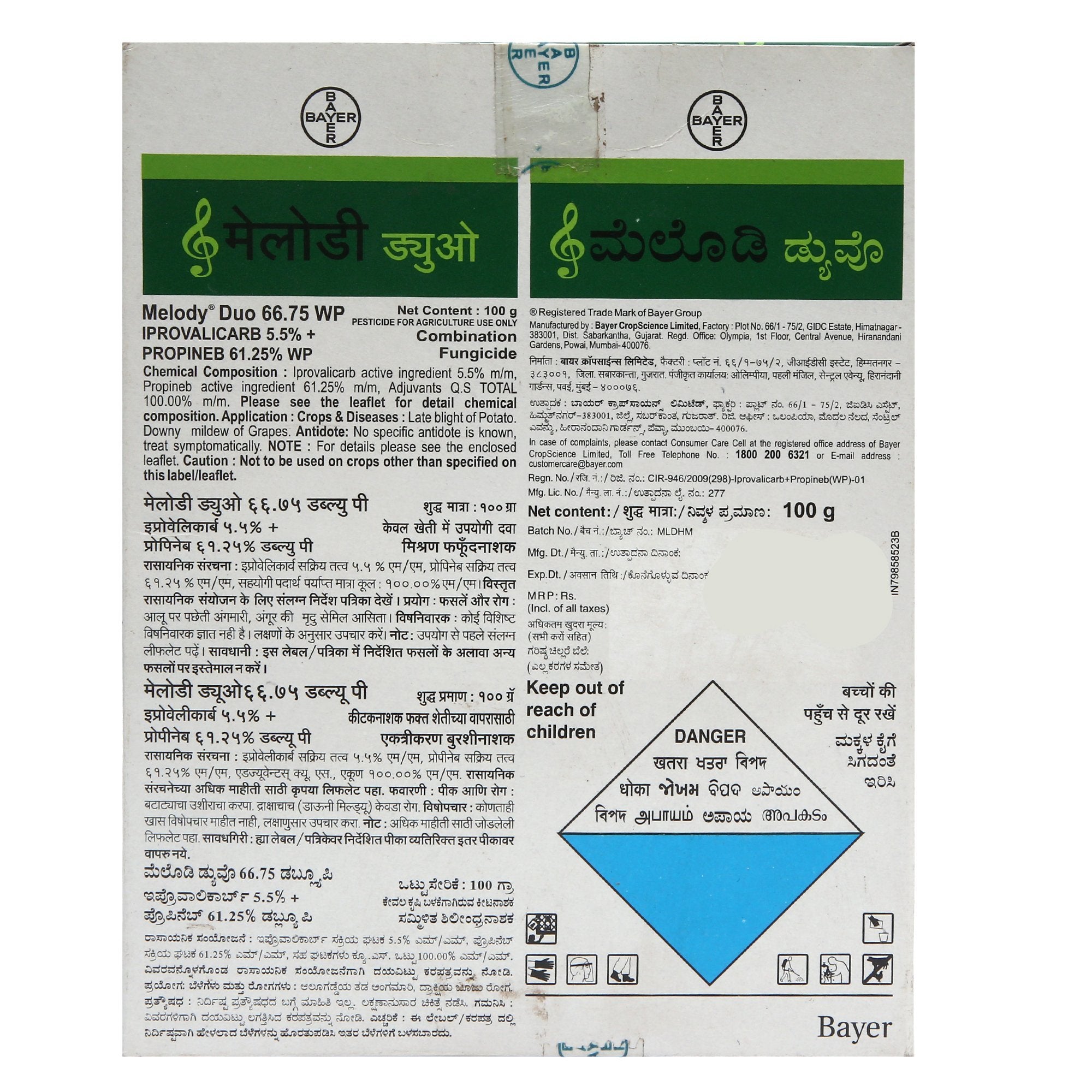 Melody Duo is a modern fungicide containing the two active ingredients Iprovalicarb and Propineb. It provides excellent control of a broad range of fungal species from Oomcytes class (e. g. Plasmospora viticola, Phytophthora spp., Pseudoperonospora spp., Peronospora spp.) with high plant compatibility. The major crops in which Melody Duo can be effectively used are those in which Downy mildew and Late blight are economically damaging viz. grapes and potato.